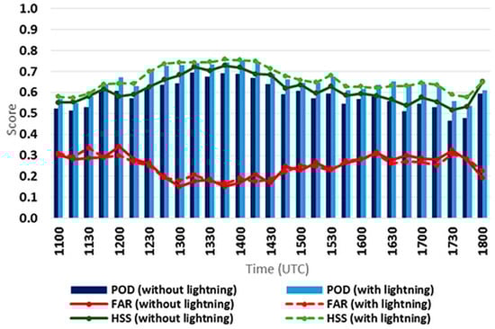 POD, FAR, and HSS during certain times of the day for the 25 cases without lightning data included (darker colors and solid lines) and with lightning data included (lighter colors and dashed lines).