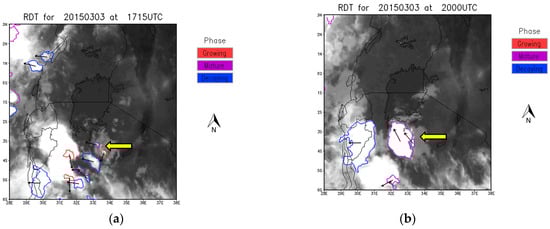The 3 March 2015 case forms part of a World Meteorological Organization (WMO) initiative of an eastern Africa Severe Weather Forecast Demonstration Project (SWFDP) that aims to provide severe weather forecasting and warning services over eastern Africa, which includes Lake Victoria []. Figure 8 shows the RDT product over the Lake Victoria area of southern Africa for 3 March 2015 at 1715 UTC (a) and 2000 UTC (b). Only satellite and NWP data were used as input in the software. On this day, a severe weather event that produced hail, heavy rainfall, and strong winds occurred south of the lake at Kahama in Tanzania []. The storm resulted in the deaths of 47 people, 5000 people were affected, and 634 houses were damaged []. The yellow arrows on Figure 8 indicate that at 1715 UTC the RDT already identified the development of rapidly developing storms south of the lake and by 2000 UTC a large mature storm was identified which was associated with hail, strong winds, and heavy rainfall. This example highlights the importance of such a product over data sparse regions for the nowcasting of thunderstorms where little observational networks exist. Currently there is no observational data available over this region to validate the products and one has to rely on reports of severe weather in order to demonstrate the usefulness of products such as the RDT over these regions.