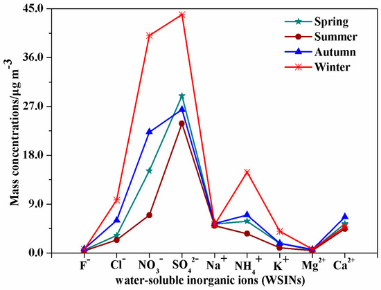 The sequence of the total mass concentration of WSIIs in the four seasons was winter (375.2 μg·m−3) > autumn (229.7 μg·m−3) > spring (200.6 μg·m−3) > summer (144.9 μg·m−3), presenting distinctly seasonal variation. The result states that less rainfall, low temperature, higher relative humidity, and no sustained wind in HS winter (Table 1) can easily strand atmospheric pollutants. In addition, increasing coal use for resident’s daily life and industrial production in winter in HS may cause high concentrations of total WSIIs.