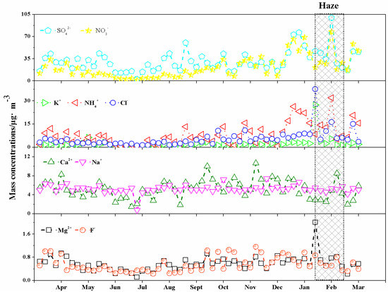 The average mass concentration of WSIIs in HS aerosols are shown in Table 2. The sequence of the mean concentrations of WSIIs in descending order was SO42− > NO3− > NH4+ > Cl− > Ca2+ > Na+ > K+ > Mg2+ > F−. The three ions SO42−, NO3−, and NH4+ were the main species, which were secondarily converted from gas precursors SO2, NOx, and NH3, respectively [4,14]. Among cations, NH4+ had the highest mean concentration (7.77 μg·m−3) followed by Ca2+ (5.29 μg·m−3) and Na+ (5.25 μg·m−3) while, among anions, SO42− had the highest mean concentration (30.9 μg·m−3), followed by NO3− (21.1 μg·m−3) and Cl− (5.32 μg·m−3).