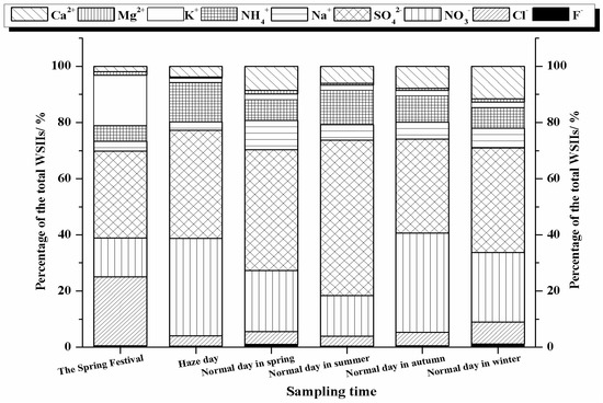 In addition, we investigated the difference among WSIIs characteristic in different days. The specific days were the Spring Festival day (9 February 2013), haze day (15 February 2013), and a normal day in spring (9 May 2012), summer (18 September 2012), autumn (17 November 2012) and winter (5 March 2013). As shown in Figure 3, the percentages of K+ (24.5%) and Cl− (17.9%) in the Spring Festival day were clearly higher than other days, verifying that firework displays could influence atmospheric particle levels. And the total percentages of the major species K+, Cl−, SO42− and NO3− in the Spring Festival day reached 84.1%. In haze day, the main ions were SO42− (38.5%), NO3− (34.7%) and NH4+ (13.8%), accounting for the percentage of 87.0% of the total WSIIs. However, apart from SO42− and NO3−, there were other major ions in normal day in spring (Na+ and Ca2+), summer (NH4+), autumn (NH4+ and Ca2+) and winter (Ca2+, Cl−, NH4+ and Na+).