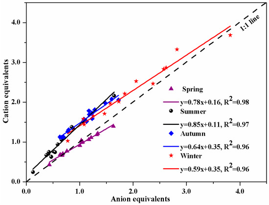 The micro-equivalent concentrations of cations and anions in PM10 were calculated by the corresponding equations [21,26,27]. The linear relationship between cation and anion equivalents in the four seasons in HS is drawn in Figure 4. The correlation coefficients (R2) reached 0.98, 0.97, 0.96, and 0.96 in spring, summer, autumn, and winter, respectively. The results suggest that the cation and anion equivalents were strongly correlated in the four seasons. The slope (cation/anion) of the linear regression was 0.78, 0.85, 0.64, and 0.59 in spring, summer, autumn, and winter, respectively. All of the slopes are significantly lower than 1, which could be best explained by the presence of hydrogen ions (H+) [20,28], implying that the aerosol particles in HS are acidic. Moreover, all of the slopes have a relatively large gap with 1, indicating that there are some other cationic ions not detected except those had been measured in this study (Na+, K+, NH4+, Mg2+, and Ca2+), such as H+ [28], organic cations, or heavy metal ions (Zn2+, Cu2+, etc.) [4]. Especially, compared with other seasons, the lowest slope appeared in HS in winter, which carries a certain probability that PM10 in HS contains organic cations or heavy metal ions in winter. This is one of the reasons that the days of heavy pollution weather in winter were more than the days in the other three seasons, such as the pollution episode in February 2013 in HS.