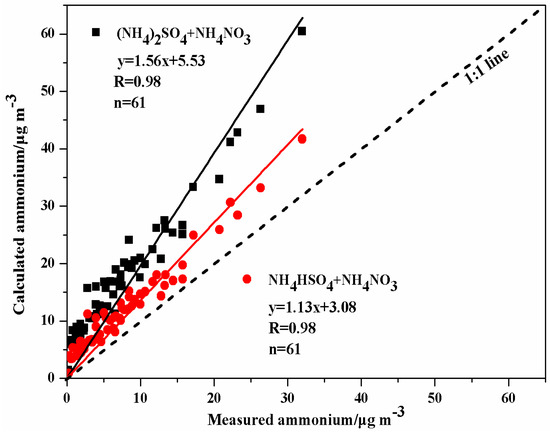 Comparisons between the calculated and measured NH4+ concentrations were conducted to evaluate the formation of ions. NH4+ concentrations can be calculated based on the stoichiometric ratios of the major compounds (i.e., (NH4)2SO4, NH4HSO4, and NH4NO3), which assumed that NO3− is in the form of NH4NO3 and that SO42− is in the form of either (NH4)2SO4 or NH4HSO4. Figure 5 shows good correlation (R = 0.98) between calculated and measured NH4+ concentrations. The slope was 1.56 when (NH4)2SO4 was assumed and 1.13 when NH4HSO4 was assumed. This suggests that the aerosol particles in HS are acidic because of the existing available NH4+ is not fully neutralized. The similar conclusion can be found in many studies [20,26,27].