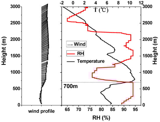 The wind direction was westerly or southwesterly above 600 m, and easterly below 600 m. The wind speed was lower than 4 m/s below 660 m, and lower than 2 m/s below 100 m and between 350 and 550 m (Figure 6).
