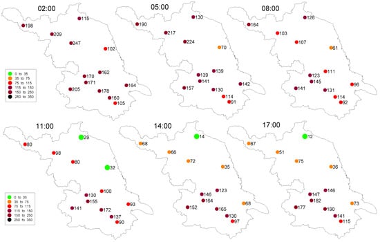 In order to analyze the pollution transportation of this purple haze, the 72 h backward trajectories during the purple haze were calculated (Figure 8). The length of cluster-mean trajectories determines the transport speed of the air masses. A longer pathway equates to faster transport. From 72 h backward trajectories, we can see that all of the air parcels were recirculated within a 300 km area, the air parcels at 50 m, 150 m, and 300 m height are all circled in Jiangsu province. Figure 9 shows the surface PM2.5 concentrations from 02:00 to 17:00 on 22 December 2015 (local time) in 13 cities of Jiangsu, and it can be seen that the pollutions were all greater than 100 µg/m3 in the south of Jiangsu. The upstream transportation caused the PM2.5 concentrations to increase to a high level.