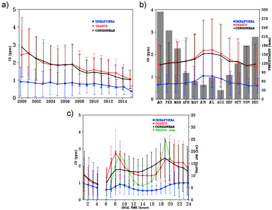 The behavior of the annual, seasonal, weekly and daily variations of CO concentration in the Megacity of São Paulo were prospectively studied. Based on the results, we concluded that in terms of annual variations, CO concentrations decreased in all studied sites, in 0.114, 0.086 and 0.034 ppm per year−1 for Congonhas, Osasco and Ibirapuera, respectively. This trend in the reduction of CO over the years is attributed mainly to the decrease in vehicle emissions due to new technologies and the implementation of environmental laws which demand that the car manufacturers comply with the standards of emission enforced by public agencies, since the vehicle fleet has increased every year. Similar results were also observed in other studies for other locations [15,51]. Among the localities analyzed in this study, Osasco and Congonhas presented the highest levels of CO concentration, however, also indicated the greatest decreases. The high concentration of this pollutant for these two stations is due their location, close to avenues with intense vehicular traffic. Ibirapuera station, because it is located inside a park and more distant from the roads, presented the lowest values of concentrations when compared to the other stations (around 55% considering the average among 16 years).