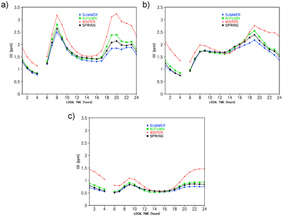 The diurnal cycle analysis of each day of the week clearly shows the impact of the vehicular traffic on the diurnal variation of CO concentration levels. On weekdays, a similar behavior is observed, except after 20 h. For these times, in most locations, Friday presents the highest CO concentrations. This feature is directly associated with highest traffic congestion according to the traffic engineering company. On Sundays, peaks occurred at night because of the return of vehicular traffic at the end of the weekend. For the first hours of the day (between 1 and 4 h), weekends present higher values of CO concentration due to the contribution of the previous day’s emissions and greater atmospheric stability during the nighttime. The diurnal cycle of CO concentration, analyzed for each season of the year, shows that the amount of CO in the atmosphere is higher during the winter months, followed by autumn and spring, with the lowest concentration observed during summer months.