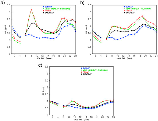 The average diurnal cycle of CO for Osasco (a), Congonhas (b) and Ibirapuera Park (c), separated by day of the week, is shown in Figure 5.