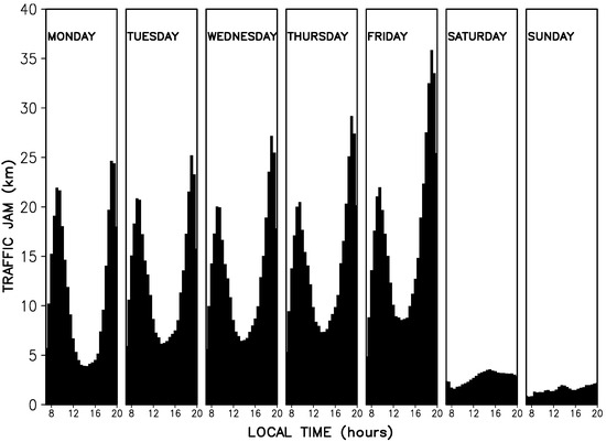 In Figure 6, the average hourly traffic jam distribution (km) in São Paulo city measured by the Traffic Engineering company (CET) during weekdays and weekends for the CO sampled regions is shown.