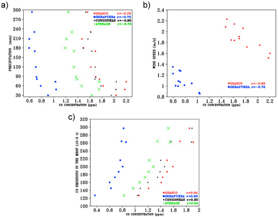 Moreover, other atmospheric conditions such as precipitation, wind speed, temperature, relative humidity all contribute to the modulation of the CO seasonal cycle. As seen in the Figure 8a,b precipitation and wind speed have strong inverse correlation with CO. In the Osasco station the correlation of wind speed and CO is higher than in the Ibirapuera station, indicating that the wind is more correlated with CO when its velocity is higher. The wind speed at the Osasco station is on average 40% higher than at Ibirapuera for all months of the analyzed period. In both stations the wind speed is lower during the months of May, June and July and higher during the months of September, October, November and December (Figure 7 and Tables S2 and S3). The lowest values of precipitation for the analyzed period occur in the months of May, June and August and the highest concentrations of CO occur in the months of June, July, August (Figure 3b and Table S1). Wind speed varies little during the year with an average of (1.08 ± 0.16 m s−1) for Ibirapuera and (1.87 ± 0.22 m s−1) Osasco station, while precipitation has a high variation throughout the year (132 ± 83 mm) and the monthly average of CO concentration for the three stations was (1.42 ± 0.20 ppm). High wind speeds enhance the turbulence and increase the dispersion and transport of CO, decreasing its concentration. When the wind speed is low, the CO emitted tends to concentrate near its sources.