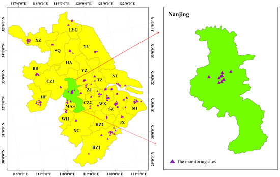 Distribution of air quality monitoring stations in Nanjing and surrounding cities.