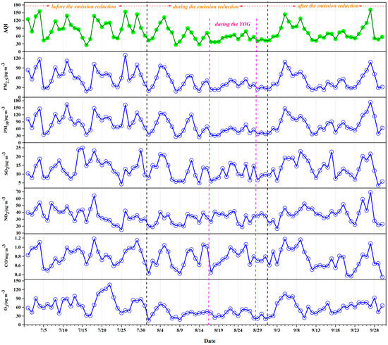 During the emission reduction, a number of control measures were adopted to guarantee good air quality in Nanjing. To understand the air quality and air pollutants variation characteristics during this period, the AQI and air pollutant concentrations were plotted against time using the average daily concentration of pollutants data in different periods (Figure 2). Table 2 shows the mean value of the AQI and the mean concentration of air pollutants during the different time periods in Nanjing.