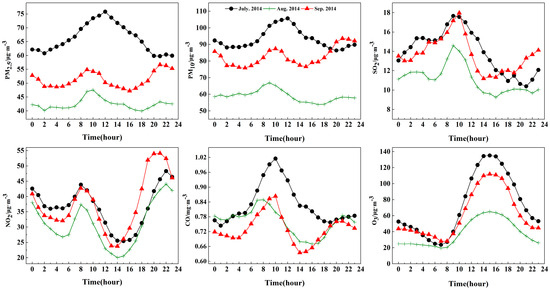 Figure 3 shows the diurnal variation of air pollutant concentrations in different periods. Although the air pollutant concentrations of each period are different, the basic pattern shows that the air pollutants diurnal variation curve in August 2014 was lower than those of the other two periods, except for CO.