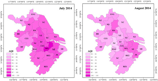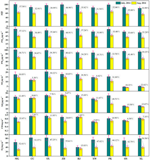 In order to analyze the spatial variation of air quality and air pollutants during the period of the emission reduction, the mean values and standard errors of the AQI and six air pollutant concentrations in nine different sites of Nanjing were compared with the period before the emission reduction, as shown in Figure 4. The AQI during the emission reduction was lower than that in July 2014 at all monitoring stations; the percentage of decrease of ranged from 31.54 to 44.90% on spatial variation, which indicated the effects on air quality of implementing the reduction measures.