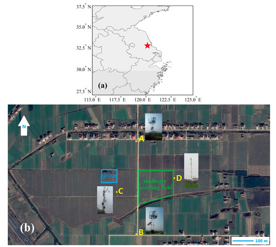 (a) Map of eastern China; the location of the experimental site is shown as a red star; (b) The experimental site. Points A and B are the transmitter and receiver of the large aperture scintillometer (LAS) with an optical path of 470 m, respectively; C is the eddy covariance (EC) system; and D is the automatic meteorological station (AWS). The mulberry seedling field and grove field are also shown with green and blue frames, respectively. Concrete roads are shown as white bands.