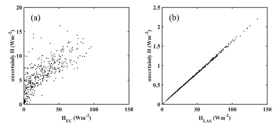 The uncertainty of EC-derived sensible heat fluxes was also calculated through Finkelstein and Sims’ [51] method; the results under unstable conditions are shown in Figure 3a with the increase of HEC; the uncertainty of HEC could increase from almost zero to about 17 W m−2; and the mean uncertainty was 5.46 W m−2.