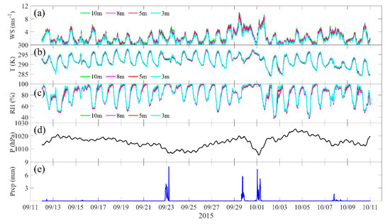 Temporal variations of (a) wind speed at 3-, 5-, 8- and 10-m heights (lines); (b) air temperature at 3-, 5-, 8- and 10-m heights; (c) relative humidity at 3-, 5-, 8- and 10-m heights; (d) surface atmospheric pressure and (e) precipitation from 12 September–11 October 2015.