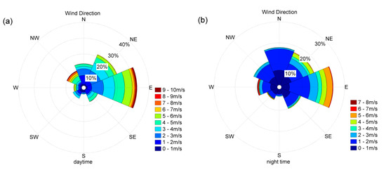 Distributions of (a) wind directions at 10-m height during the daytime and (b) wind directions at 10-m height during nighttime.