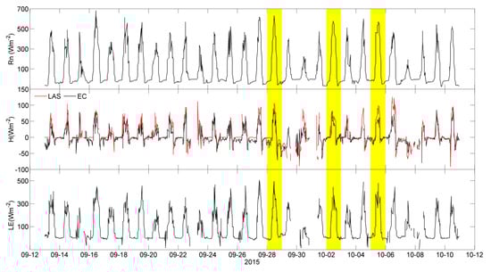 Variations of sensible heat fluxes (H), latent heat fluxes (LE) and net radiation (Rn) from 13 September–11 October 2015. The three days that are discussed in Section 4.3 are marked in yellow.