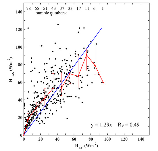The relationship of HLAS and HEC is shown in Figure 7 with negative values omitted. The red points and the corresponding bars represent the median values binned at 5 W m−2 of the HEC interval and the interquartile ranges, respectively. The median of HLAS was 13.09 W m−2 greater than the median of HEC on average when HEC was at the range of 0–80 W m−2. For the data where HEC exceeded 80 W m−2, the sample numbers were too small to exactly estimate the relationship between HLAS and HEC. Overall, HEC shows that the sensible heat fluxes varied from 0 to about 80 W m−2 on the rice paddy fields in eastern China during the maturity period of rice, and it is similar to the measurement during the rice growth period [31].