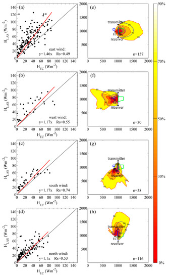 To clarify the reason that HLAS tended to be larger than HEC during the observation period, the effects of wind direction, speed and the associated footprint (the model of Kormann and Meixner [55]) are investigated in this subsection.