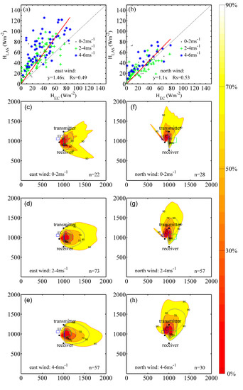 Further, measurements under east and north wind conditions were selected to analyze the influence of wind speeds and the associated footprint. The wind speeds are categorized by 0–2, 2–4 and 4–6 m s−1, while the condition is which wind speeds are larger than 6 m s−1 is not considered here due to their infrequent occurrence. For different wind speed conditions under east (north) wind directions, Figure 9a,b shows the observed HLAS and HEC, and Figure 9c–h presents the corresponding averaged footprints. Under easterlies of 0–2, 2–4 and 4–6 m s−1, the footprint extended more eastward when the wind speed increased, and the corresponding contributions of the mulberry seedling field were 53.51% (19.21%), 41.07% (28.25%) and 35.23% (26.71%) for LAS (EC), respectively. Generally, with the increase of the speed of easterlies, the mulberry seedling field contributed less for LAS, but more for EC. When the east winds were at speed of 0–2, 2–4 and 4–6 m s−1; the average HLAS (HEC) were 33.87 (21.50), 47.76 (30.17) and 69.91 (37.69) W m−2, respectively. Following the increasing of wind speed category, the contributions from the mulberry seedling field to LAS and EC became closer to each other, but the difference between the average HLAS and HEC became larger, which was probably caused by the larger sensible heat fluxes’ difference over the mulberry seedling field and rice paddies under higher wind speeds and larger average net radiation (the average net radiation was 320.05, 363.24 and 395.75 W m−2 for 0–2, 2–4 and 4–6 m s−1).