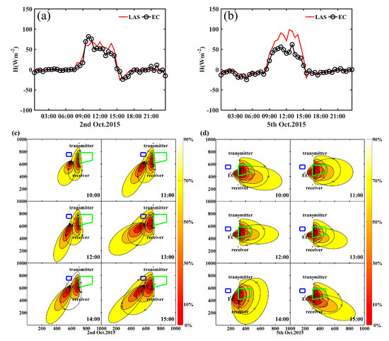 Variations of HLAS and HEC on 2 (a) and 5 October (b). Footprints of sensible heat fluxes measured by EC and LAS systems on 2 October (c), and on 5 October (d). The blue rectangle represents the grove field, and the green trapezoid represents the mulberry seedling field. Additionally, the corresponding time is marked in the lower right corner of picture.