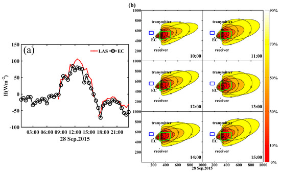 The sensible heat fluxes vary under different weather conditions (net radiation, wind, etc.) during the observation period (Figure 6). To investigate the mechanisms of the fact that HLAS were inclined to be larger than HEC, three typical sunny days (28 September, 2 and 5 October, marked as yellow in Figure 6) were selected to analyze the possible impact of the varied wind conditions (i.e., direction and speed) on the measured sensible heat fluxes. During the three days, the daily variation of net radiation was similar, so that the impact of net radiation on sensible heat fluxes could be omitted. Besides, LAS and EC measurements can have higher reliability when the values of sensible heat fluxes are relatively large under the free convective conditions. Therefore, only the data collected between 10:00 and 15:00 were used here, and the EC system measurements were very low depending on where it was placed compared to the core of the thermal motion during this time period. During 10:00 and 15:00 on the three days, Rn, HLAS and HEC were always larger than 400, 50 and 30 W m−2, respectively. The 10:00–15:00 averages of net radiation (Rnavg), latent heat fluxes (LEavg), wind speed (WSavg) and sensible heat fluxes (HLASavg and HECavg) were calculated (Table 2). Further, with the footprint model of Kormann and Meixner [55], the averages of the mulberry seedling field contributions for LAS (KLASmavg) and EC (KECmavg) measurements during 10:00 and 15:00 were calculated based on their weighted area proportions of the calculated footprint source area.