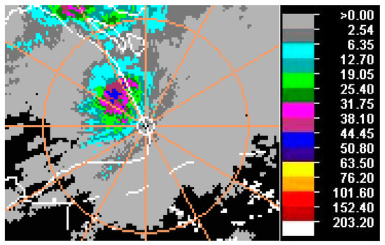 At 7:00–8:00 that morning (Beijing time, similarly hereinafter), the seven automatic rainfall stations in Shanghai measured precipitation that exceeded 100 mm, among which the precipitation of Xujiahui station reached 117.5 mm/h, and the station had never met this since it started keeping meteorological records in 1872 [15]. At 9:12, the typical spiral rain clusters were discovered on the Shanghai OHP radar map (see Figure 1, the white line is the coastline, the white circle is the location of the radar station, the distance from the orange circle to the radar station is about 30 nautical miles (approximately 56 km), the color bar denotes precipitation/h). The figure shows that the rain cluster has two obvious spiral arms, the convective precipitation in the cluster center is at a maximum, decreasing outwardly. The convective precipitation is larger in the spiral arms, and the farther from rain cluster center, the weaker of convective precipitation in the rain cluster and its spiral arms. The horizontal scale of this rain cluster is 30 km.