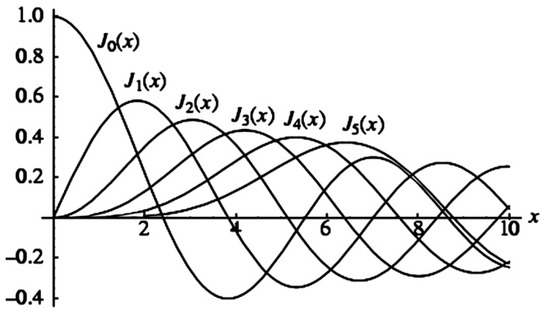 In which, is an -order Bessel function (m is zero or a positive integer), represents the amplitude, and (the equiphase line is obtained when is constant). When , because , decreases with increasing r for the equiphase line and, thus, the line is rotating in a spiral. The results suggest that there are spiral arms within rain clusters at locations far from the center (the rain cluster is still circularly symmetric when m = 0). It is known that in the Bessel function has decreasing amplitude as increases, thus, when , (Figure 2). Therefore, while r increases, the amplitude of decreases, indicating the reduced strength of spiral arms of rain clusters.