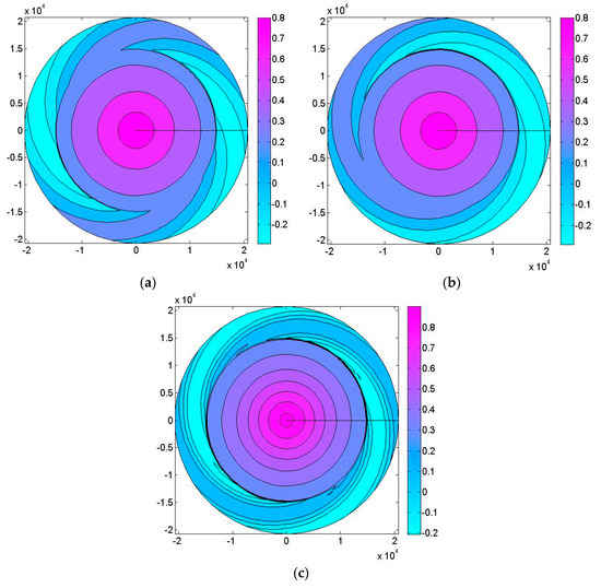 The approximate analytical solutions to the horizontal structure function of the vertical movement of developing rain clusters (Equation (10.1)) was derived for locations close to, and far from, the rain cluster center. As a result of the difficulties in the mathematical process, it is difficult to obtain a global numerical solution. Therefore, MATLAB software (MathWorks, Natick, MA, USA) was adopted in this study to seek a global numerical solution, thereby providing an overall understanding of rain clusters with spiral arms. Figure 3 is a global numerical solution for taking different parameters. In Figure 3a, the global numerical solution of the model of rain clusters is obtained assuming that m = 2, k = 1 km−1 and R = 20 km, which is similar to the characteristic parameters of the actual rain clusters in this paper. Here R is the radius of the tangent circle to the square border (the same below), which reflects the horizontal scale of rain clusters. As it can be seen from the diagram, there are two spiral arms at locations far from the center of model of rain cluster when m = 2. The horizontal structure of the vertical movement of the rain clusters are distributed in circular symmetry near to the center, and the ascending motion intensity is the greatest in the center of the circle. The ascending motion intensity on the axis of the spiral arm is also larger. With the increase of distance from the center of the circle, the ascending motion intensity on the spiral arms is weakened. Figure 3b is the global numerical solution of the model of rain clusters assuming that, m = 2, k = 1 km−1 and R = 20 km. Due to m = 1, there is only one spiral arm, and the distribution characteristics of its vertical ascending motion intensity is also regular, as shown in Figure 3a. Figure 3c is the global numerical solution of the model of rain clusters assuming that m = 2, k = 2 km−1 and R = 20 km. As it can be seen from the diagram, the angle between the spiral arm and tangent circle becomes smaller due to the increase of K, but the distribution characteristics of its vertical ascending motion intensity also has the above regular pattern. The results of the numerical calculation are consistent with the above theoretical analysis.