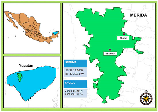 This study considered two urban sites located within the Merida Metropolitan Area. One of them located in the center of the municipality of Merida (named SEDUMA) is in a zone with important economic, commercial, cultural and touristic activity, within the facilities of the Urban Development and Environment Secretary of the State of Yucatan. The other site is located in Cholul (one of 133 counties of the Merida Metropolitan Area with 5161 inhabitants), close to hospitals, shopping malls, universities and educational centers in a highly frequented area. Figure 1 shows the specific location of both sampling sites.