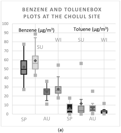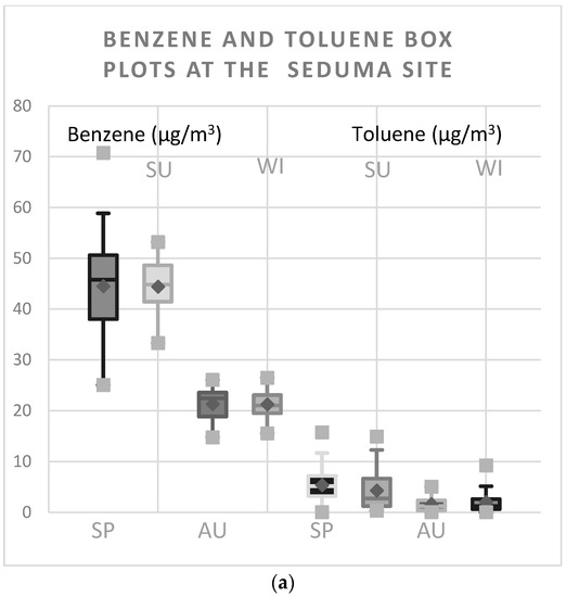 Seasonal variation and descriptive statistics for BTEX concentrations at the SEDUMA site. Note: SP: Spring season; SU: Summer season; AU: Autumn season; WI: Winter season. The central horizontal bars are the medians. The lower and upper limits of the box are the first and third quartiles. Where