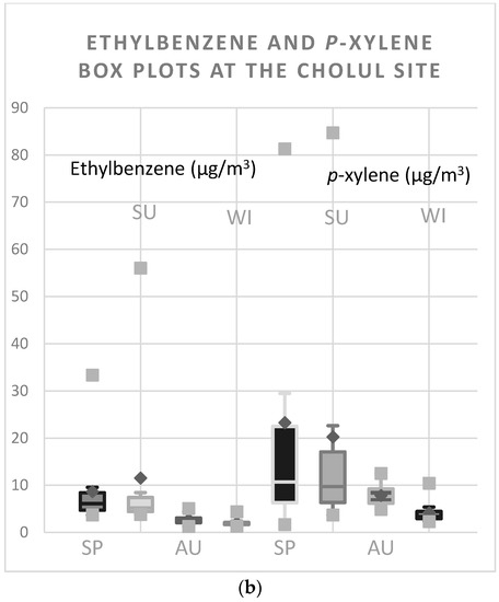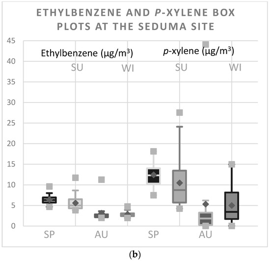 represents maximum and minimum values; the horizontal width of the box has no statistical significance and is only for better visualization. (a) box plots for benzene and toluene concentrations at the SEDUMA site (b) box plots for ethylbenzene and p-xylene concentrations at the SEDUMA site.