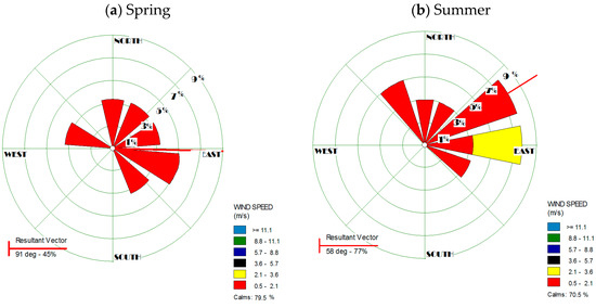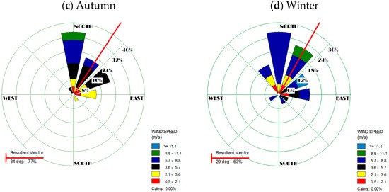 Seasonal wind roses for the study area. (a) wind rose for spring season (b) wind rose for summer season (c) wind rose for autumn season (d) wind rose for winter season.