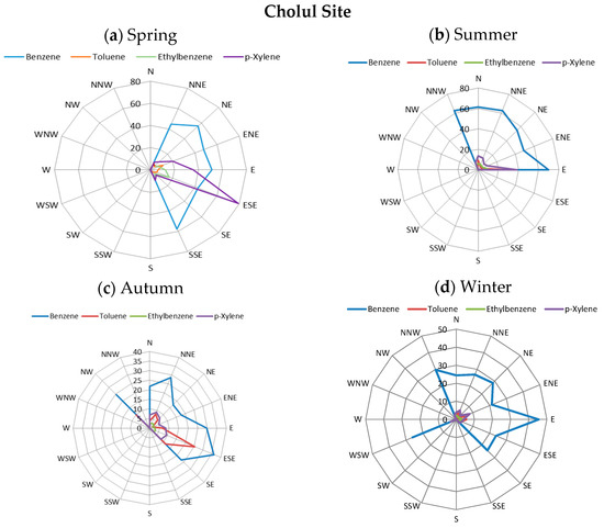 For the Cholul site during the spring season, ethylbenzene and p-xylene had higher median concentrations when winds came from ESE, whereas benzene and toluene showed higher levels (medians) when winds blew from NE and ENE, respectively (Figure 5). During summer and winter, all BTEX probably had common sources since all of them showed higher median concentrations when wind blew from E, except for p-xylene in winter, which presented higher levels (medians) when wind came from ENE (Figure 5). During autumn, benzene, toluene and p-xylene had higher values of concentration (medians) when the wind had an ESE direction (except for ethylbenzene, which showed higher levels with winds coming from N) (Figure 5).