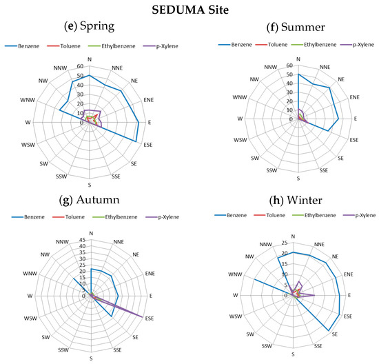 For the SEDUMA site, during spring, toluene and ethylbenzene had higher concentrations with winds blowing from NW, while, benzene and p-xylene had higher concentration values when wind blew from E and NE. In summer season, higher concentrations were found when wind blew from NE for ethylbenzene and p-xylene, from N for benzene and from ESE for toluene.