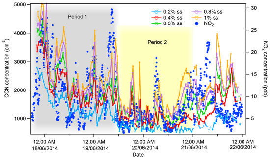 The time series of the observed CCN concentrations are shown in Figure 1, along with the NO2 concentrations. ΝΟ2 was chosen as a reference for local pollution because of its limited atmospheric lifetime from emission (versus other secondary pollutants, e.g., O3) and its high correlation with particulate matter [31]. As expected, CCN concentrations increased with increasing supersaturation. Throughout the measurement period, CCN concentrations at each supersaturation level varied up to a factor of three. The measured CCN at the three highest supersaturations were often very similar, indicating that most CCN are large (larger than 80 nm) and activate at relatively low cloud supersaturations, which is indicative of the high degree of aging for the CCN in the region [33]. The CCN concentration time series can be divided into two periods, based on CCN levels. Period 1 represents the highest concentrations (17, 18, and 19 June), which were concurrent with low wind speeds and a stagnant, capped shallow planetary boundary layer (PBL) [18]. Period 2 (second half of 19 and all of 20 June) was characterized by less stagnation, increased PBL ventilation and a concurrent decrease in PM and CCN concentrations.
