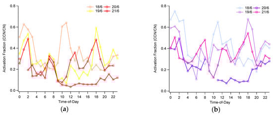 Diurnal variability of the activation fractions (CCN/CN) during the measurement period for: (a) 0.4% supersaturation; (b) 0.8% supersaturation. Activation fractions between 0.6–1% supersaturation did not differ considerably.