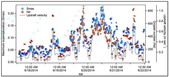 Based on the methodology developed in Section 2.3, we calculated the maximum supersaturation (smax) that would form in a cloud, given the knowledge of the aerosol number size distribution, chemical composition and updraft velocity; the number of droplets (Nd) that are formed under these conditions is then given by the CCN concentration at smax. Figure 3 represents the calculated time series of smax and Nd with respect to the estimated updraft velocity. It can be seen that the droplet number correlates with the updraft velocity very well. When taking into account the CCN time series (Figure 1), smax is negatively correlated, owing to the increased competition for water vapor when CCN concentrations increase. During Period 1, when CCN concentrations were the highest, updraft velocities remained very low (owing to stagnant PBL conditions) and particles strongly competed for water vapor. Therefore, the potential smax was very low, below 0.05%, keeping the potential Nd at relatively low levels (100–200) and shifting the size of particles affected by cloud processing to large sizes (>155 nm). This level of supersaturation is extremely low, implying that the clouds forming may have been fogs, which can be indistinguishable from haze (as the growth rates of droplets at such supersaturation are very low) [47]. Therefore, even if aerosol concentrations may be high and vary substantially, this variability will not reflect on the Nd timeseries, as its sensitivity to aerosol is very low (see the estimated contribution of Na to Nd variance of 6–12% in Figure 4c). Fluctuations in aerosol and CCN concentrations may also be partially affected by boundary layer height variability; nevertheless, in an urban environment such as Athens, emissions from local sources and their atmospheric processing are mostly responsible for the observed concentrations [39]. These findings are in accordance with recent studies where new particle formation and biomass burning events were augmented by 87% or higher, but led to only a 12% (or less) increase in Nd [31,32]. During Period 2, total aerosol and CCN concentrations were lower, which as expected leads to higher maximum supersaturation levels (around 0.18%). Despite the lower CCN levels, cloud updraft velocities were elevated, eventually yielding higher levels of estimated Nd, compared to Period 1 (Figure 3). The respective sensitivity of Nd to aerosol is much higher (Figure 4c).