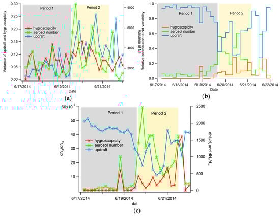 From Equation (2) and the calculated partial sensitivity of Nd to the total aerosol number, hygroscopicity parameter and updraft velocity, their relative contributions (εNa, εκ and εw, respectively) to the droplet number are estimated by: