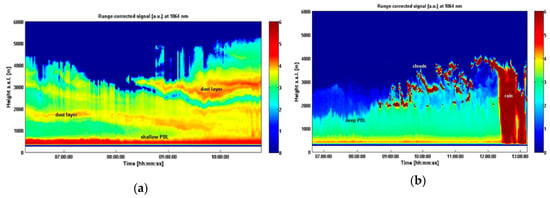 Collocated EOLE Raman lidar measurements (1064 nm) for June 18 (a) and June 20 (b) denoting the PBL structure and the presence/absence of aerosols and clouds.