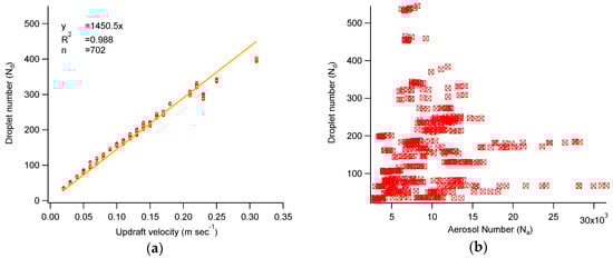 Correlation of droplet number with updraft velocity (a) and total aerosol number (b) during Period 1, when updraft velocities were low and aerosol numbers were high.