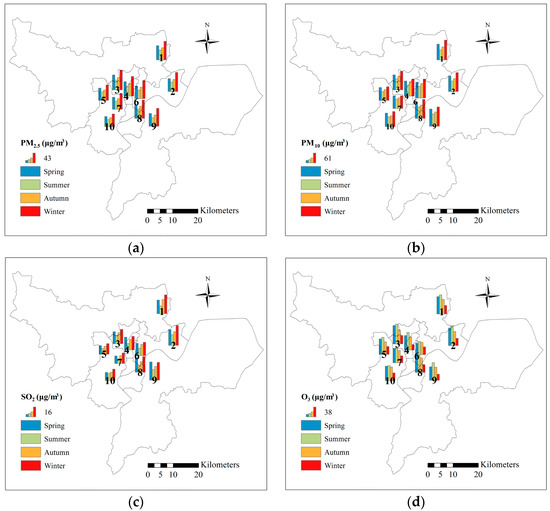 Spatial distribution of seasonal average concentrations of particulate matter and trace gases in Hangzhou City for 2014–2016: (a) PM2.5 (μg/m3); (b) PM10 (μg/m3); (c) SO2 (μg/m3); (d) O3 (μg/m3); (e) NO2 (μg/m3); (f) CO (mg/m3).