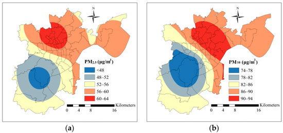 For the quantitative relationship between air pollution and land use, we interpolated the annual average concentrations of particulate matter and trace gases from 10 monitoring sites in Hangzhou City and surroundings by an ordinary kriging method. We adopted kriging interpolation because this stochastic method produces the best linear unbiased estimation of the pollution level [47]. The kriging interpolations of annual average concentrations of PM2.5, PM10, SO2, O3, NO2, and CO for 2015 are shown in Figure 12. Both PM2.5 and PM10 show high concentrations in the middle region compared with the western parts of the Hangzhou region. The concentration of SO2 increases from west to east. A low concentration of O3 is observed in the central region, and a high value is observed in north-central and south-central regions. The annual CO level decreases from north to south. The average concentrations of each air pollutants for the street-town unit are quantitatively calculated for the quantitative analysis.