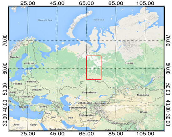 Projected map of test region (in red boundaries) enclosing Khanty-Mansiysk Autonomous Okrug, Russia. The background map is from GoogleEarth© with modification.