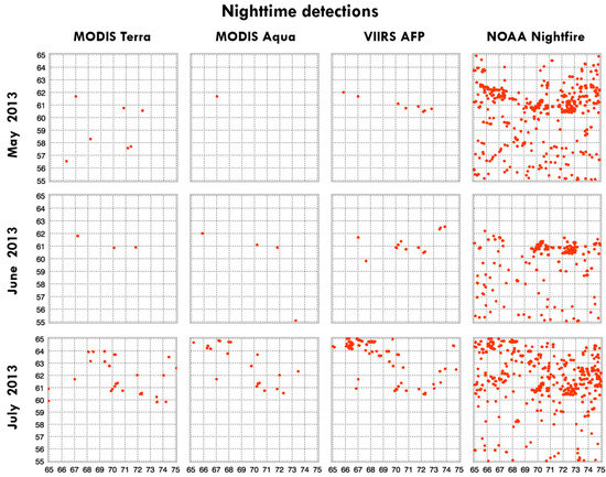 Following the procedure above, a total of 99 such grids were found, and 75 of those grids showed hotspot activity in them for at least 30 days. Figure 3 shows these areas as yellow boxes along with detections from MODIS Terra, MODIS Aqua, and VIIRS active fire products during the nighttime for five summer months of 2013.
