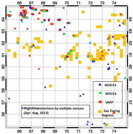 Nocturnal detections by different sensors over the gas flaring regions in the study area (April–August 2013). X- and Y-axis show the longitude and latitude, respectively.