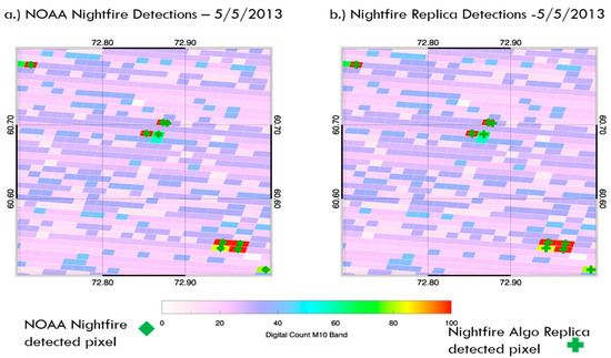 To understand the functioning of the VNF algorithm, we replicated the algorithm as described in the work by Elvidge et al. [16] and applied that to the same study region and time period of this study. The replication was confined only to the hotspot detection and threshold calculation part; we did not delve into the hot source area and temperature estimation part as performed by the authors using Planck curve fitting. The primary reason to perform the replication was to familiarize oneself more with the intricate details and working of a product which was much more efficient in detecting flares than others, but the process eventually revealed some discrepancies found in the product version 1.0. Detections in the five VIIRS bands of M10, M7, M8, M12, and M13 were performed using VIIRS level 2 data and compared to VNF. A small sub-region of the study area persistently showing hotspots was chosen, and level 2 data was collected for a random day (5 May 2013). Figure 4 shows that we are able to replicate the results of VNF. After replicating the VNF product with multispectral data and gaining insight into the way it worked, we probed further into how such vast differences in nighttime fire detection (mainly flares in this particular case) between this product and other official fire products could be reconciled.