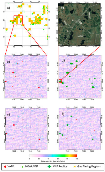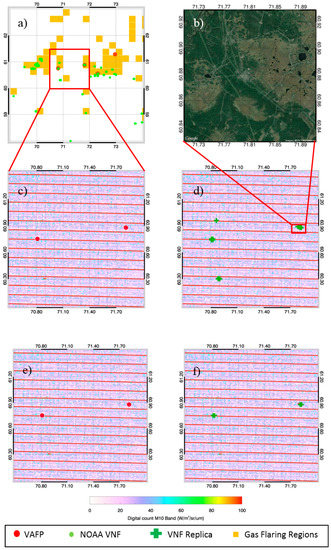 Case 1: 4 July 2013; Area (latitude: 60°–61.5°, longitude: 70.5°–72°). Only two counts of fires were reported by the VAFP in the small target region, but the M10 VNF replica gave 13 counts of hotspots in the same region (Figure 5c,d). We increased the threshold to five times the calculated value (in digital counts (DC)) for the M10 band in the VNF replica, and the number of hotspots detected with this new higher threshold was reduced to seven. These seven hotspots still contained the two hotspots seen by VAFP. Upon stepping up the threshold further to now ten times the original M10 threshold in DC, only four detections from the VNF replica were observed, again identifying the two hotspots seen by VAFP (Figure 5e,f). When the threshold was raised 30 times, the exact spots were matched by the two products. It was concluded from this particular case study that the detections from the two products could be matched by increasing the threshold manifolds and that VAFP detected hotspots that had really high DC values in the M10 band. One of the hotspots detected by VAFP and the VNF replica vaguely shows an industrial settlement when looked at with zoomed in Google imagery (Figure 5b), and there is a good probability of it being a flow station for gas flares. Further zoom was unavailable to confirm this theory, and the other spot could not be verified because of the same zoom limitations. It also showed that really hot gas flares can be picked up by VAFP as well, even though it is primarily designed for detecting bigger fire activities like forest fires and biomass burning.